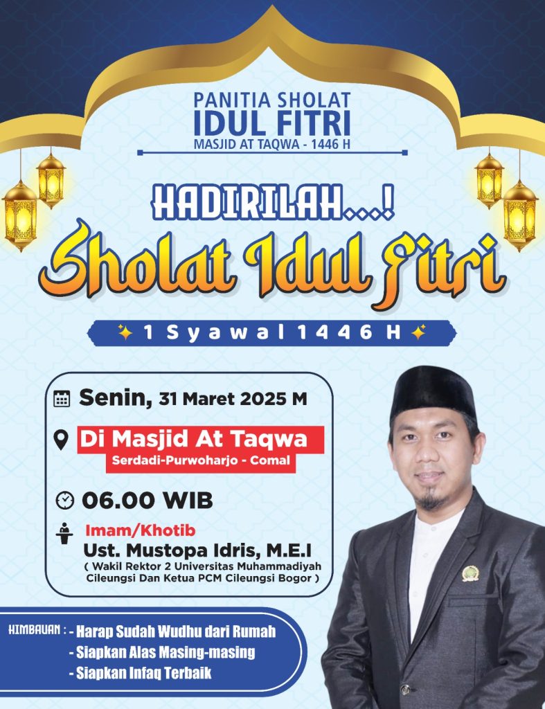 Pemalang – Pimpinan Cabang Muhammadiyah (PCM) Comal menggelar Sholat Idul Fitri di Masjid At-Taqwa, Comal Pemalang. Senin(31/3/2025). Dihadiri oleh ratusan jamaah. Sholat Id berlangsung dengan khidmat dan penuh kekhusyukan, dipimpin oleh imam sekaligus khatib Ustad Mustopa Idris M.E.I Ketua PCM Cileungsi Bogor.