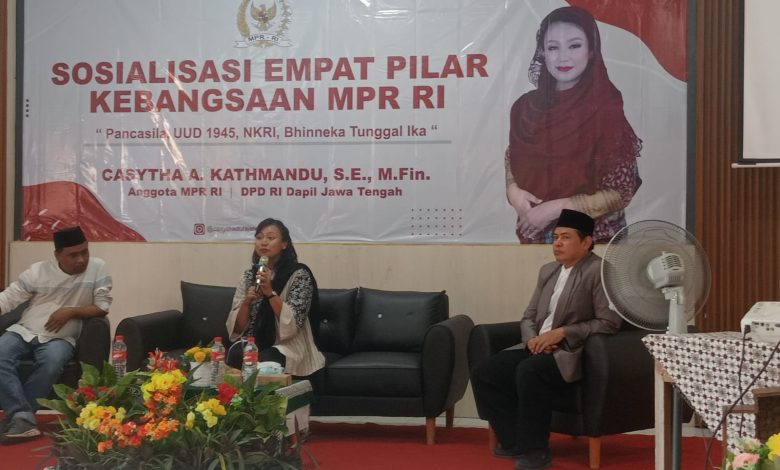 PEMALANG – Anggota MPR sekaligus DPD RI, Casytha Arriwi Kathmandu, menggelar kegiatan sosialisasi Empat Pilar Kebangsaan di Al Manaar Muhammadiyah Boarding School (A-MBS) Pemalang. Selasa(22/7/2025). Dalam kesempatan tersebut, dia menyampaikan bahwa Empat Pilar Kebangsaan mencakup Pancasila, UUD 1945, NKRI, dan Bhinneka Tunggal Ika sebagai fondasi utama kehidupan berbangsa dan bernegara.